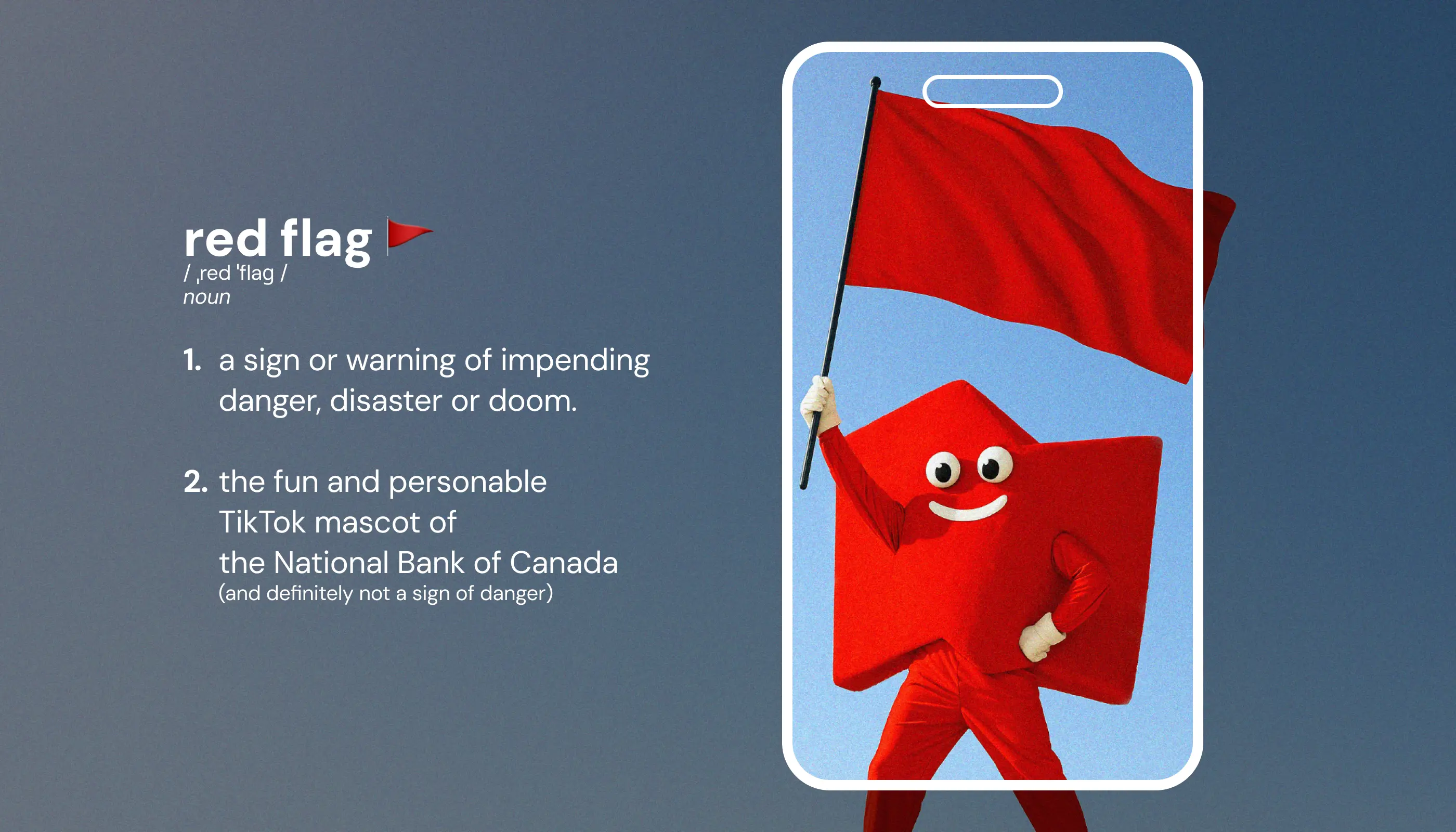 The National Bank of Canada, the sixth largest commercial bank in the country, wanted to make waves with their arrival on TikTok. To make it happen, we built a TikTok content strategy with the main goals of increasing brand love and rejuvenating the overall image of the bank. But the twist: the account would be managed by a mascot, a literal walking red flag (and the logo of the bank).